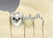 | ブリッジは固定式になりますので、取り外したり、装置を洗ったりする手間はかかりません。また、しっかりと両隣の歯に固定されているために、モノを食べる際にも、違和感なく、美味しく食べることができます。 | 3本分を連続で補うことはできるのですが、5本からは支える歯に負担が大きすぎて、できないということ。次に、両隣の歯で支えますので、一番、奥の歯が抜けてしまうと支える歯がなくなってしまい、ブリッジをかけることができなくなってしまいます。さらに、ブリッジも両隣の歯で支えますので、この支えている歯に負担がかかってきます。 |